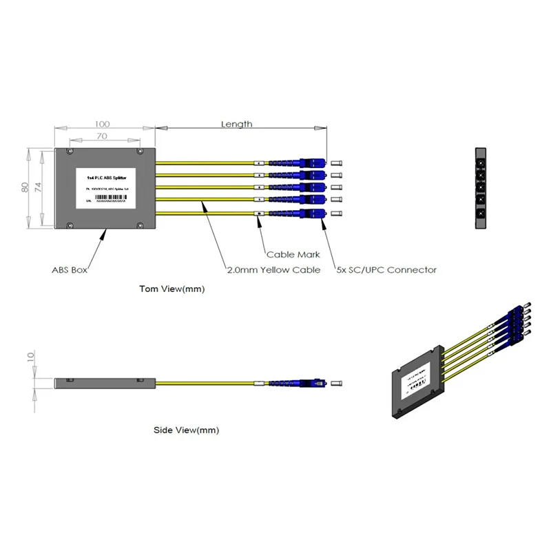 1x4平面ライトウェーブ回路カセットスプリッターパッケージ100x80x10mm、φ2.0黄色のPVCケーブル長2.0 +0.1/-0m、5pcs SC/UPCコネクタ。